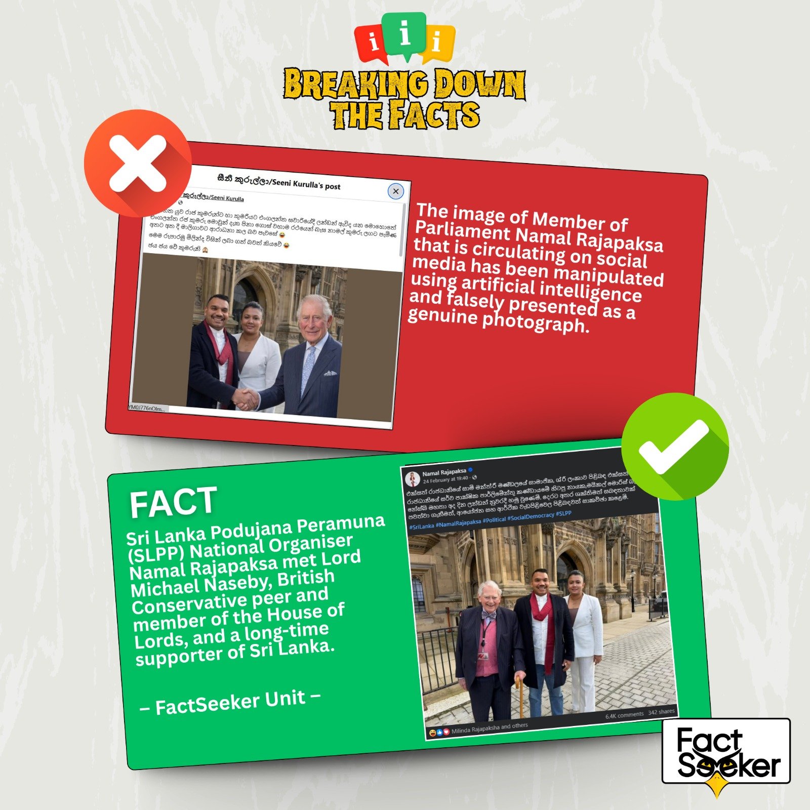 A photo circulating on social media claims to show Sri Lankan MP Namal Rajapaksa meeting King Charles III. However, an investigation by factseeker confirms that the widely shared image has been digitally manipulated using artificial intelligence and does not represent an authentic photograph.