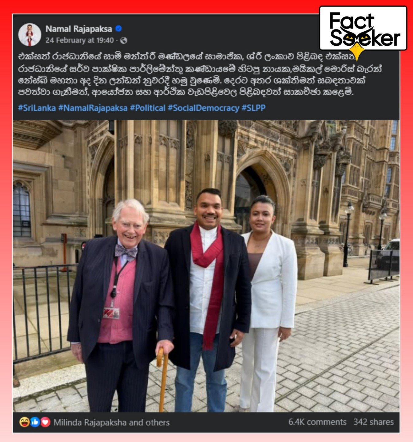 The authentic image from the meeting was published by Daily Mirror, clearly showing the actual setting and composition of the encounter (see: https://www.dailymirror.lk/print/caption-story/Namal-meets-Lord-Michael-Naseby/110-333851). The original photograph does not match the altered version currently circulating online.