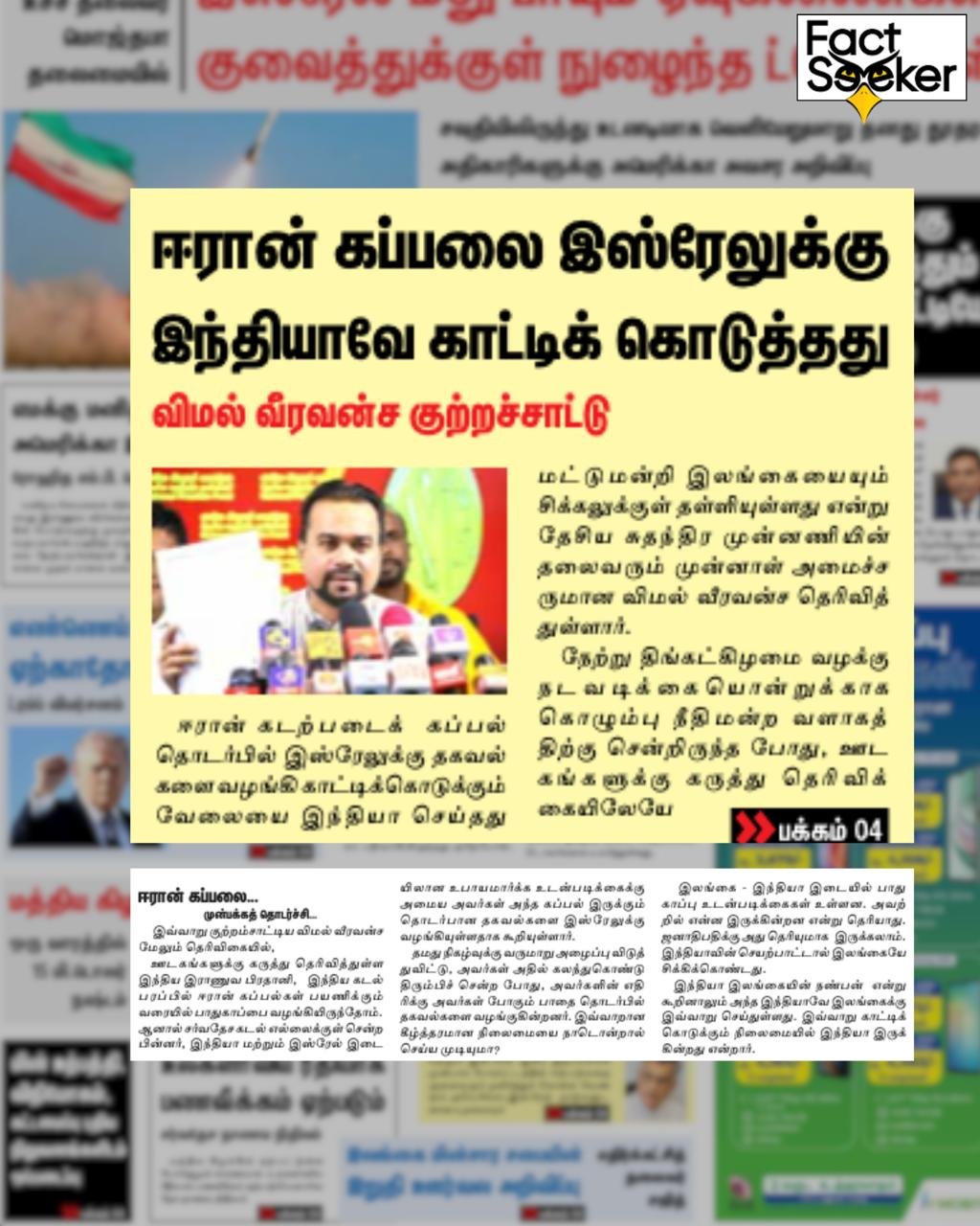 FactSeeker confirms that the video claiming General Upendra Dwivedi admitted to sharing the location of an Iranian ship with Israel is a digitally manipulated deepfake. Consequently, the statements made by former Minister Wimal Weerawansa were based on this fraudulent evidence.
