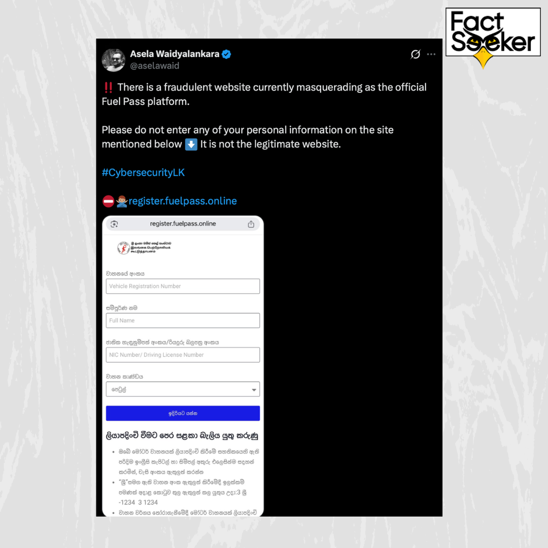 In light of the energy supply disruptions caused by the escalating conflict in the Middle East, the Sri Lankan government re-implemented the National Fuel Pass (QR) system on March 15, 2026. Following this, several fraudulent websites claiming to be official registration portals have begun circulating on social media to steal citizens’ personal data.