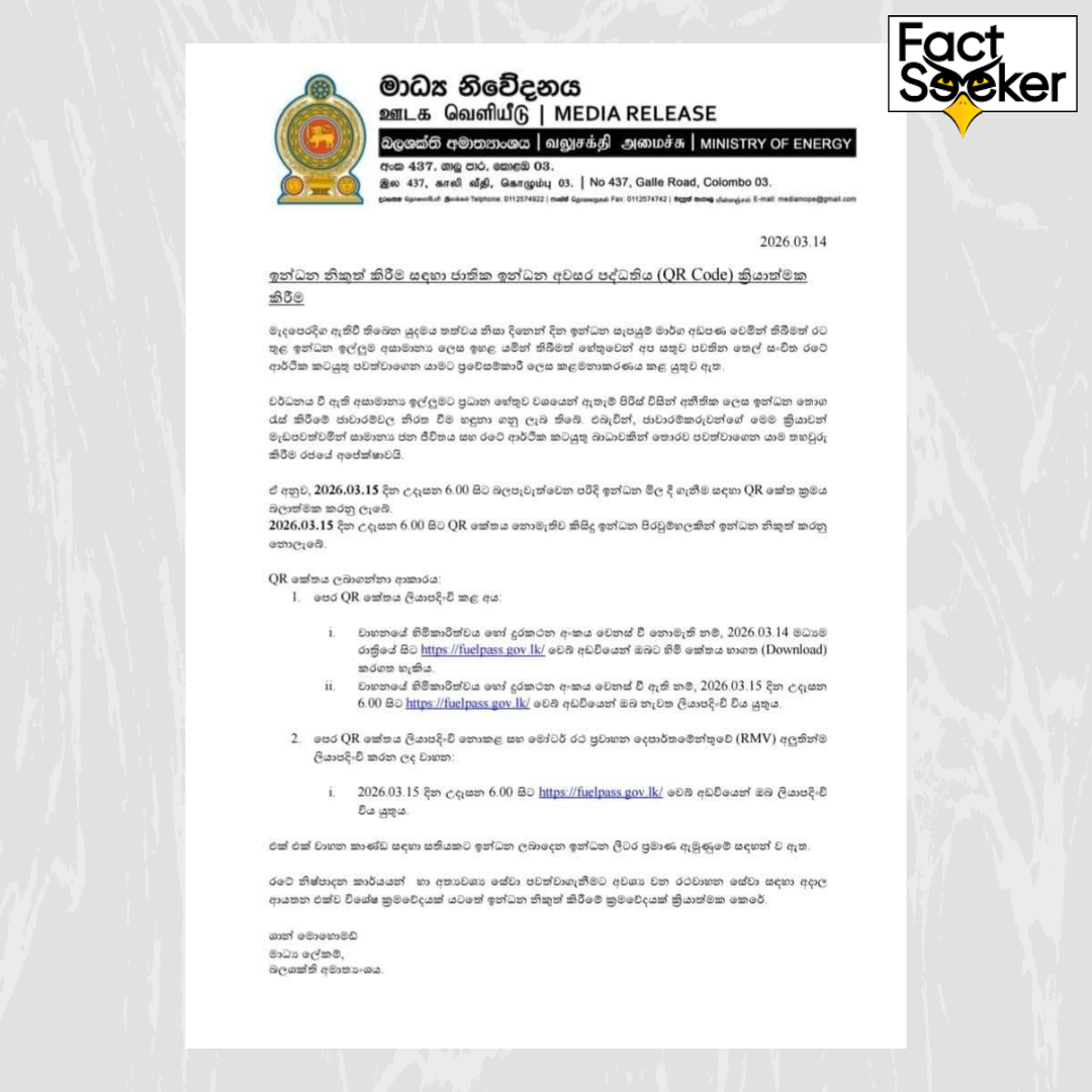 Official Directives: According to the special announcement issued by the Ministry of Energy on March 14, 2026, the only authorized website for the National Fuel Pass is http://fuelpass.gov.lk. The links currently circulating on social media are not mentioned in any official government documentation.