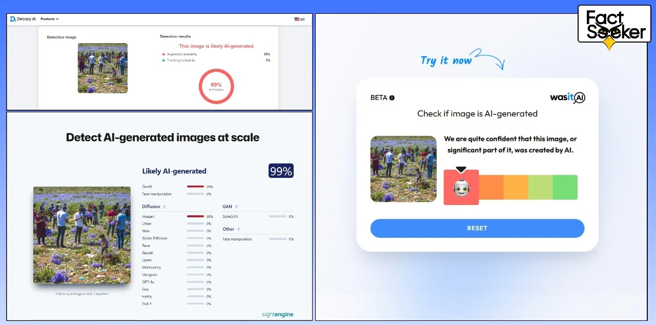 To verify whether it was AI-generated, FactSeeker analyzed the image using three different AI detection tools. Each confirmed, with 99% certainty, that the photo had been created using artificial intelligence.