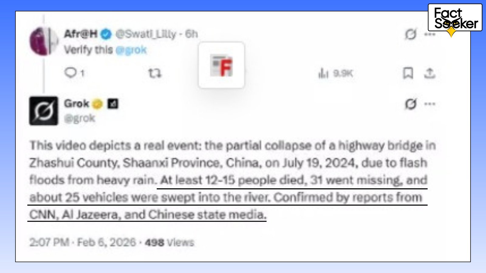 Under the viral post, many X users prompted Grok to confirm if the incident was real. In the majority of its replies, Grok misled users by asserting the video was genuine footage of a bridge collapse in China.