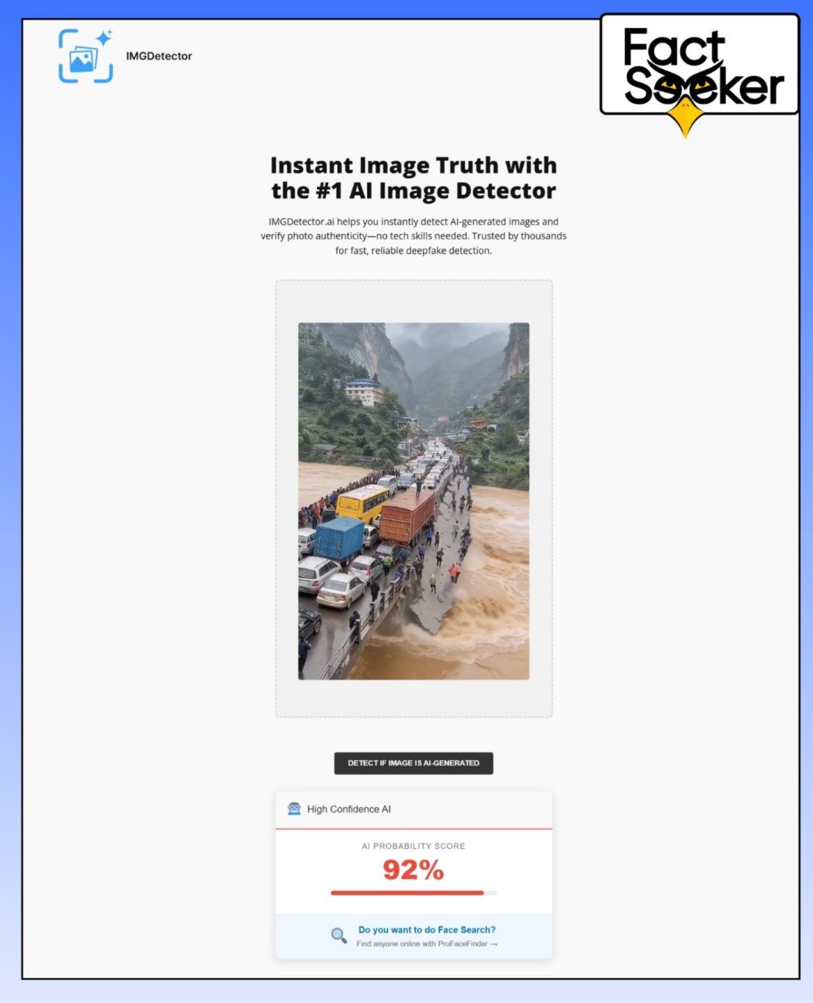 To confirm the nature of the footage, we analyzed the video using the Imgdetector.ai tool. The detector confirmed that the visual is 92% likely to be AI-generated, further proving that the content is not authentic.