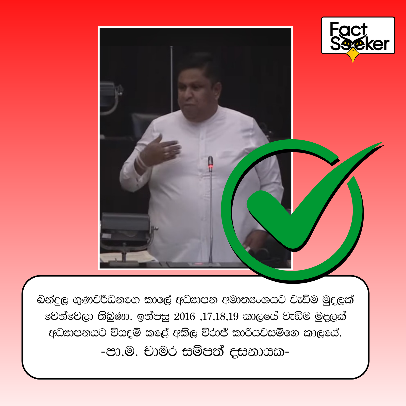 ඒ අනුව චාමර සම්පත් දසනායක මන්ත්රීවරයාගේ ප්රකාශය සත්ය බව තහවුරු වේ.