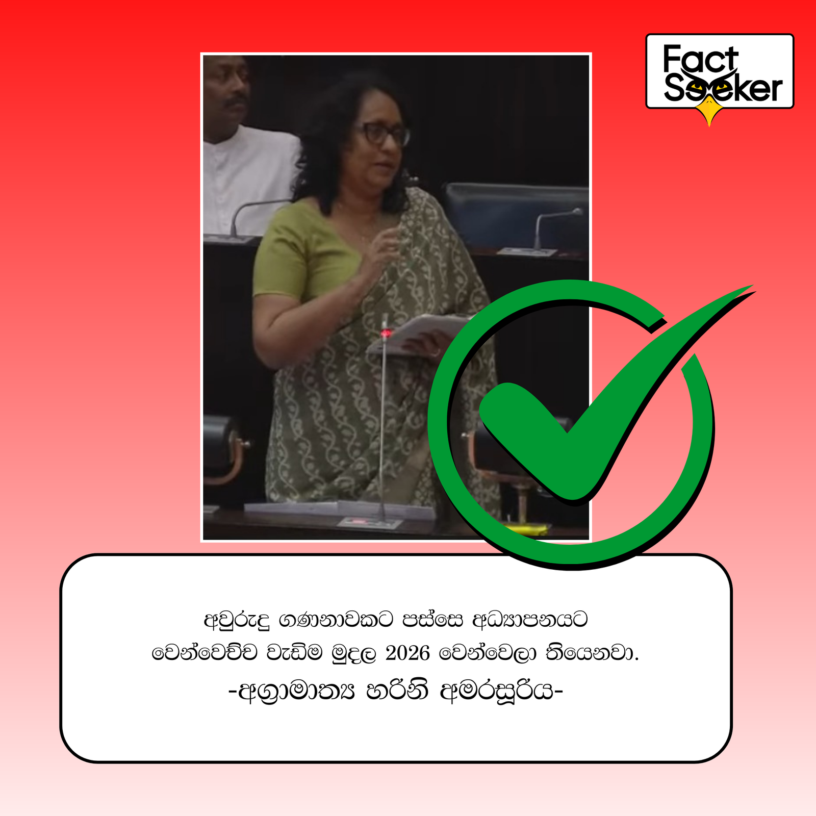 වත්මන් අධ්යාපන අමාත්යවරිය, වසර ගණනාවකට පසු ලෙසින් සදහන් කරමින් අධ්යාපනය සදහා ඉහළම ප්රතිශතයක් වෙන්කර ඇත්තේ මේ වසරේ වන බවට පැවසීම ද සත්ය වේ. එසේ වන්නේ 2018 වසරෙන් පසු වසර 07 කට පසු නැවත ඉහළ අගයක් වාර්තා වන්නේ 2026 වසරේදී වන බැවින්ය. වචනාර්ථයෙන් එයද සත්ය බව පැහැදිළි වේ.