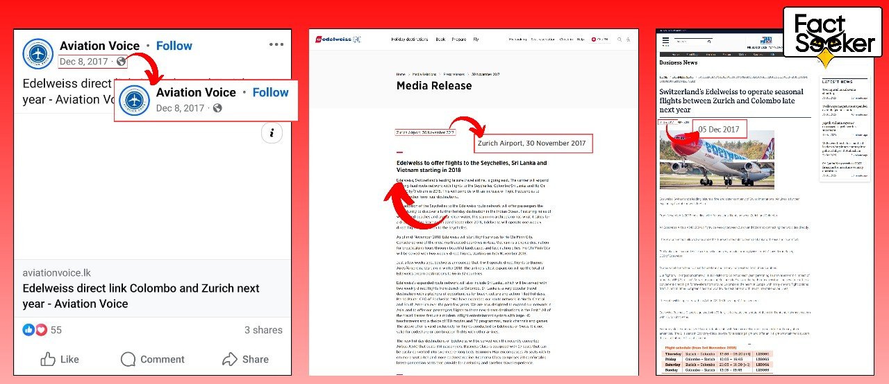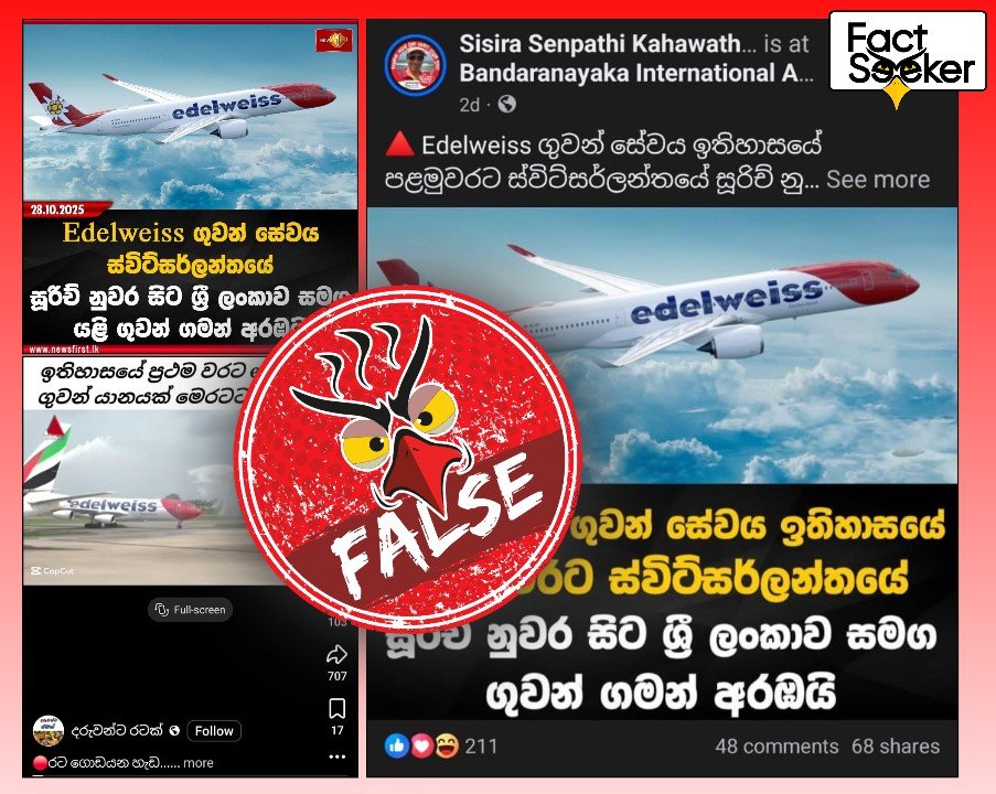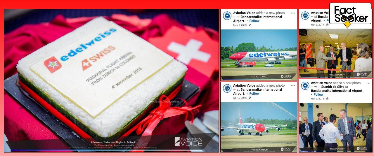 ඒ අනුව මේ සම්බන්ධයෙන් කළ විමර්ශනවලින් ස්විට්සර්ලන්තය සහ ශ්රී ලංකාව අතර ඊඩල්වයිස් (Edelweiss) ගුවන්සේවයෙන් ගුවන්ගමන් ආරම්භ වෙමින් ඉතිහාසයේ ප්රථම වරට ගුවන්යානයක් පැමිණි බවට සාමාජ මාධ්ය ඔස්සේ පළවන පුවත් සාවද්ය බව FctSeeker තහවුරු කරගන්නා ලදී