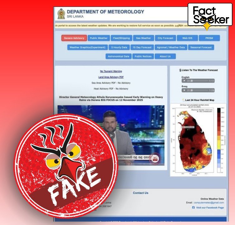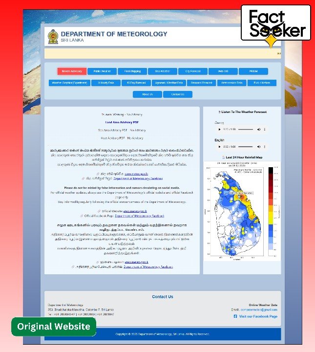 ඒ අතර දෙරණ නාලිකාවේ පුවත් විකාශනයක දර්ශනයක් කාලගුණ විද්යා දෙපාර්තමේන්තුවේ නිල වෙබ් පිටුව තුළ ඇතුළත් කර ඇති බවට දැක්වෙන ඡායාරූපයක් සමාජ මාධ්ය ඔස්සේ සංසරණය වන බව FactSeeker හට නිරීක්ෂණය විය.
