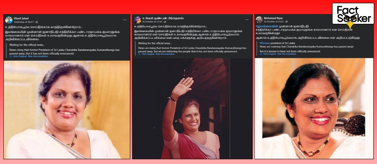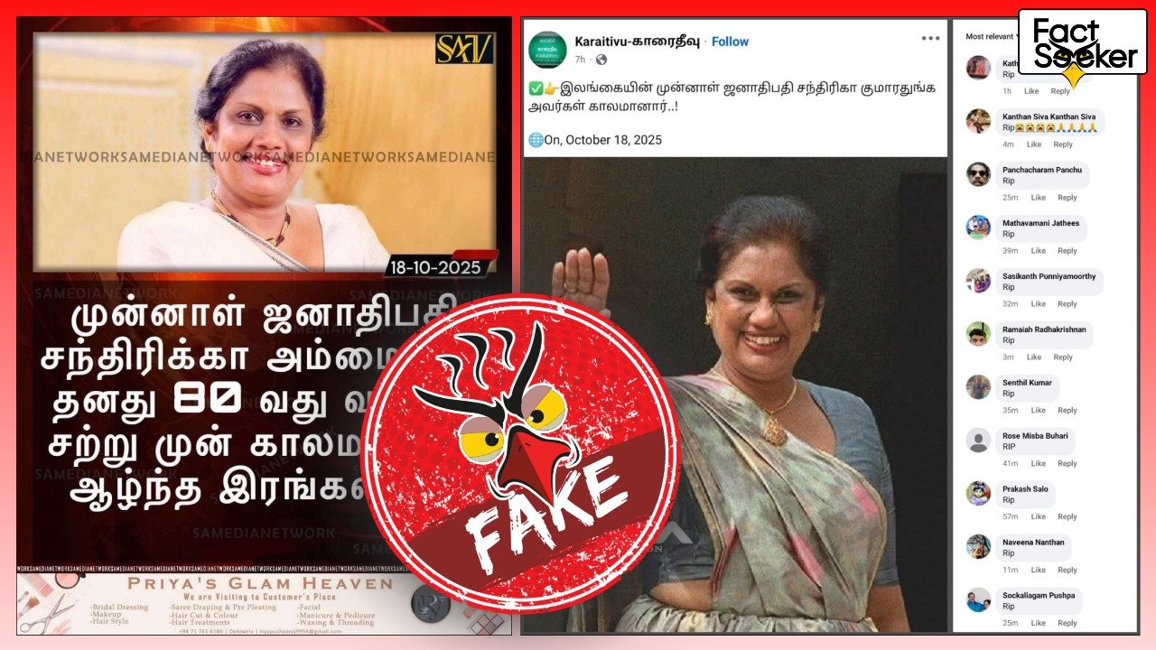 හිටපු ජනාධිපතිනි චන්ද්‍රිකා බණ්ඩාරණායක කුමාරතුංග මියගිය බවට සමාජ මාධ්‍ය ඔස්සේ පළවන පුවතක් සම්බන්ධයෙන් FactSeeker අවධානය යොමු කළේය.