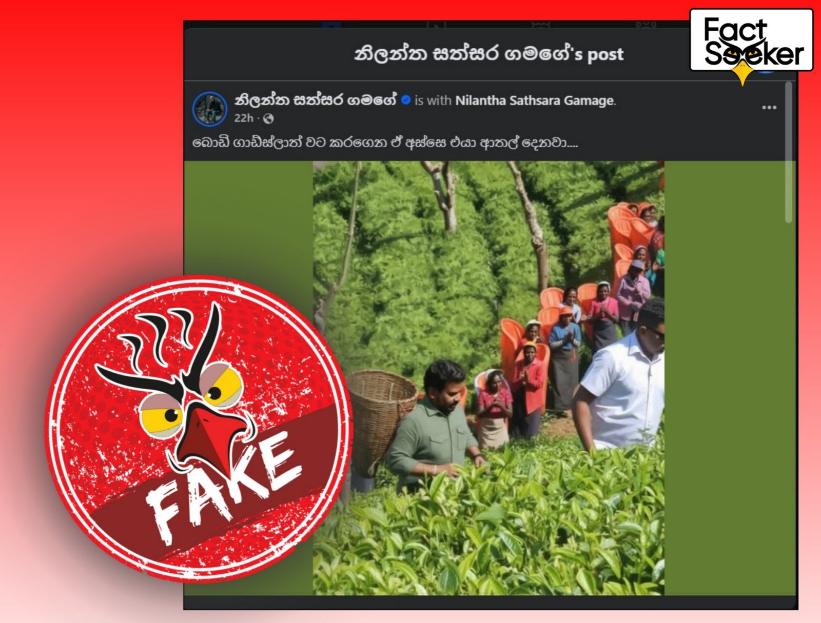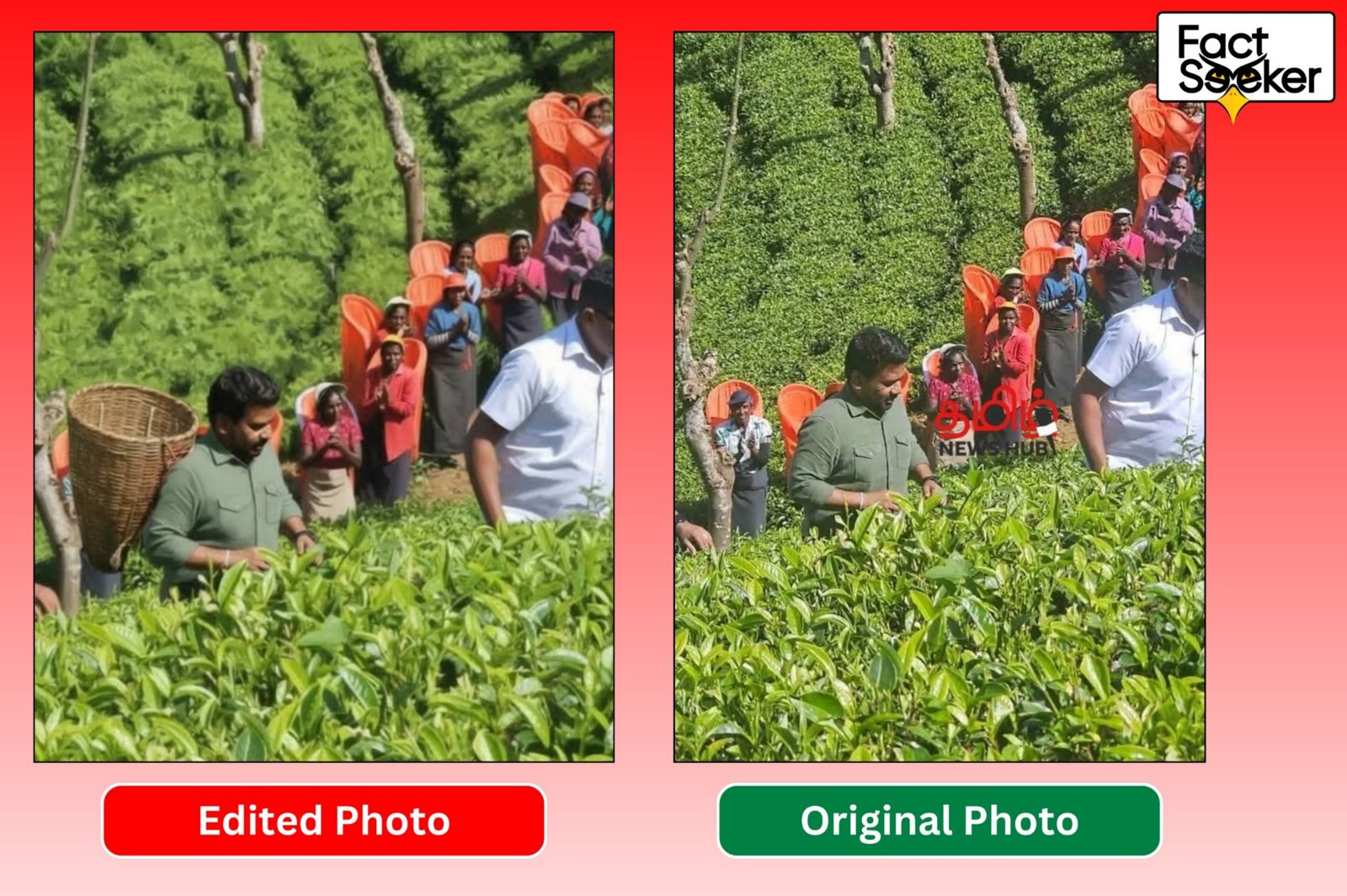 ජනාධිපති අනුර කුමාර දිසානායක මහතා තේ දලු නෙලන කූඩයක් රැගෙන යන බවට සමාජ මාධ්ය ඔස්සේ සංසරණය වන ඡායාරූපය, සැබෑ ඡායාරූපයක් විකෘති කර සකස් කරන ලද (Morphed) අසත්ය ඡායාරූපයක් බව FactSeeker තහවුරු කරයි.