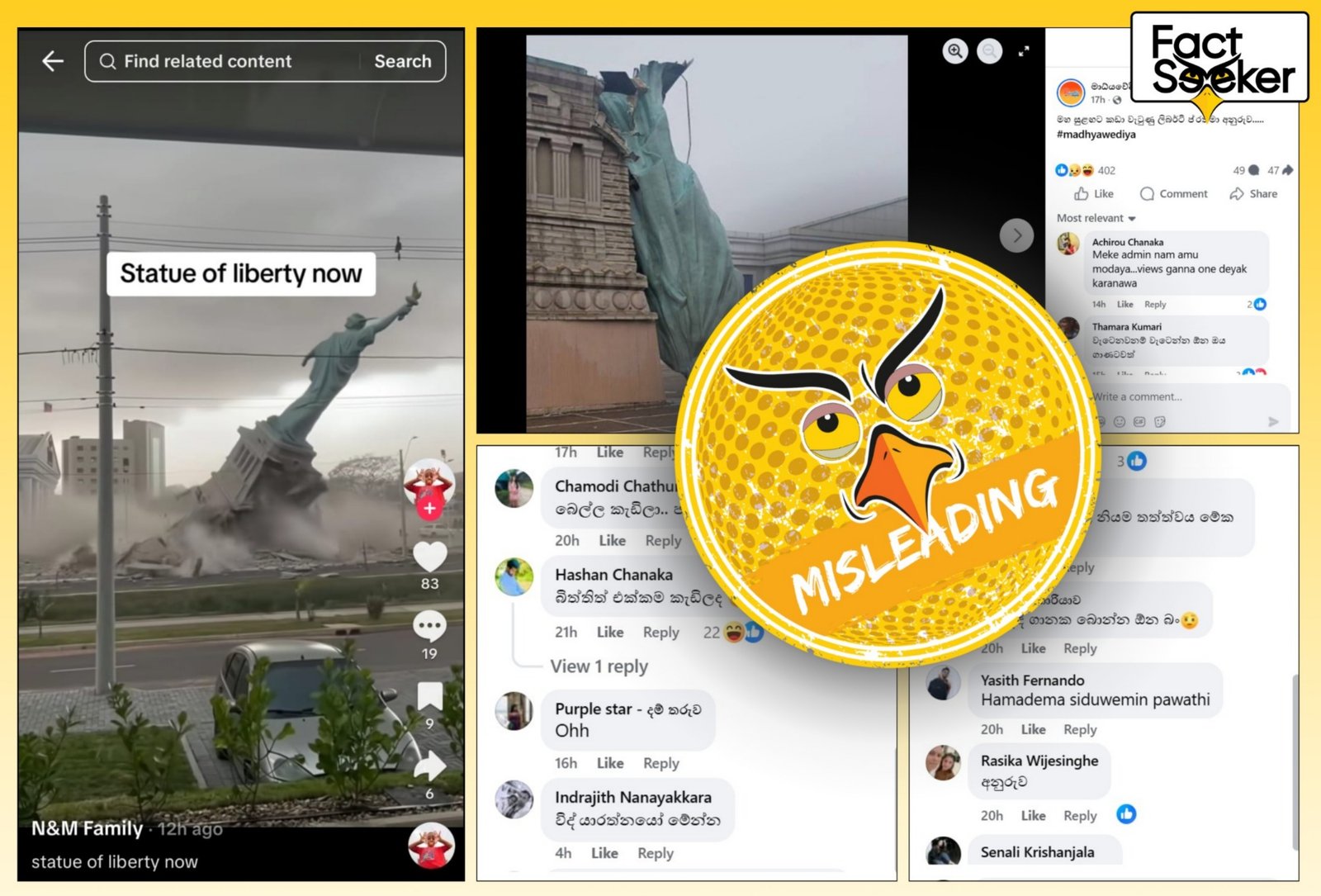 පැවති දැඩි සුළං හේතුවෙන් ඇමරිකාවේ නිව්යෝක් නුවර පිහිටි ලෝක ප්රකට නිර්මාණයක් වන ලිබර්ටි ප්රතිමාව කඩා වැටී ඇති බවට පුවත් සමාජ මාධ්ය ඔස්සේ සංසරණය වී තිබුණි. සමාජ මාධ්ය පරිශීලකයින් එය අසත්ය පුවතක් බවට සදහන් කර තිබූ අතර ඇතැම්හු අදහස් දක්වා තිබුණේ, එවැනි සිදුවීමක් සිදුවී ඇති නමුත් එය නිව්යෝක් හි පිහිටි ලිබර්ටි ප්රතිමාව නොවන බවත්ය. මේ ආකාරයේ පරස්පර අදහස් මෙම සිදුවීම සම්බන්ධයෙන් පළවී තිබූ බැවින් එහි සත්යාසත්යව පිළිබඳව සොයා බැලීමට FactSeeker කටයුතු කළේය.
