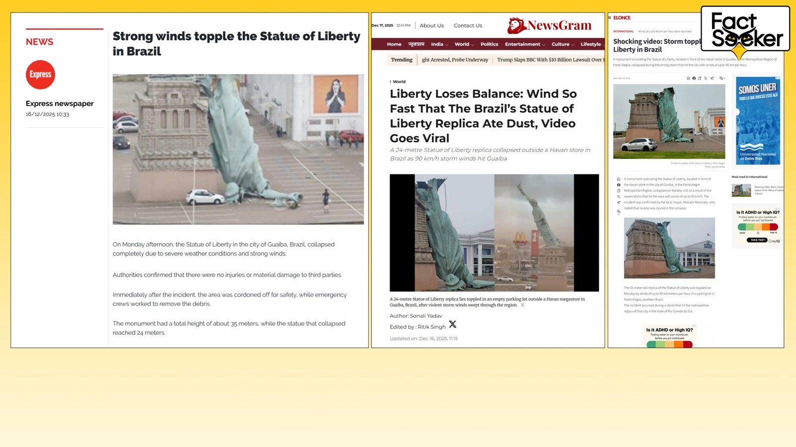 මෙම කරුණු අනුව ලිබර්ටි ප්රතිමාව කඩා වැටී ඇති බව දක්වමින් සංසරණය වන ඡායාරූප සහ වීඩියෝ හි සදහන් වන්නේ නිව්යෝක් නගරයේ පිහිටි ලිබර්ටි ප්රතිමාව නොවන බවත් බ්රසීලයේ ගුවායි හි පිහිටා ඇති ලිබර්ටි ප්රතිමාවේ අනුරුවක් බව FactSeeker තහවුරු කරයි.