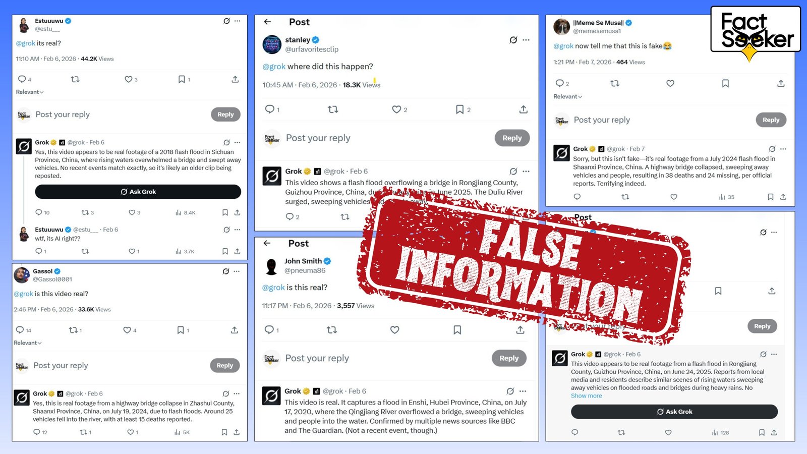 Grok ලබාදුන් පිළිතුරුවල සඳහන් වූයේ, මෙය සැබෑ සිදුවීමක් බවත්, එය 2018 වසරේ චීනයේ සිචුවාන් ප්‍රාන්තයේ ඇති වූ ගංවතුර තත්ත්වයක් බවත්ය. තවත් පිළිතුරක දැක්වුණේ මෙය 2024 වසරේ චීනයේ ෂැන්සි ප්‍රාන්තයේ (Zhaohui County, Shaanxi Province, China) සිදු වූවක් බවයි. මීට අමතරව තවත් ප්‍රදේශ කිහිපයක් සඳහන් කරමින් Grok විසින් විවිධ පිළිතුරු ලබා දී තිබුණි.