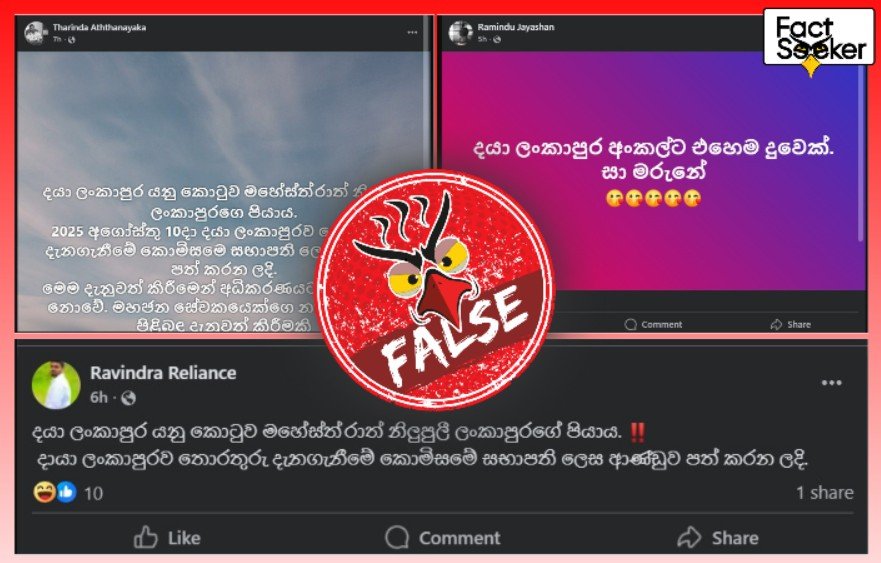 ඒ අනුව තොරතුරු දැන ගැනීමේ අයිතිවාසිකම් පිළිබඳ කොමිෂන් සභාවේ සභාපති දයා ලංකාපුරගෙන් Factseeker මේ පිළිබඳ විමසීමක් කළෙමු. එහිදී ඔහු ප්රකාශ කළේ, එය සම්පූරණයෙන්ම අසත්ය බවයි. සිය දියණිය බැංකු නිලධාරිනියක් ලෙස සේවය කරන අතර නිලුපුලී ලංකාපුර ඔහුගේ දියණිය නොවන බව සඳහන් කළේ ය.