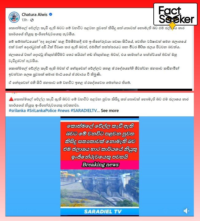 ඒ අනුව සමාජ මාධ්ය ඔස්සේ වික්ටෝරියා , කන්තලේ සහ මොරගහකන්ද යන ජලාශ වල වේලි කැඩී යාමේ අවදානමක් පවතින බවට සමාජ මාධ්ය ඔස්සේ පළවන පුවත් අසත්ය බව FactSeeker තහවුරු කරන ලදී.