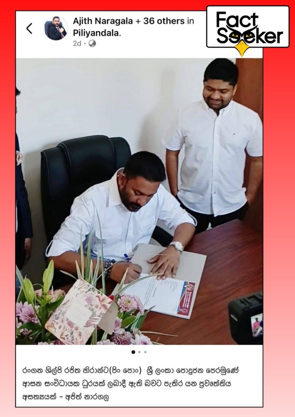 මේ අතර කැස්බෑව ආසන සංවිධායක ලෙස රජිත හිරාන්ප චාමිකර පත් කර ඇති බව පළ වන ප්රචාර අසත්ය බව අජිත් නාරගල විසින් සිය ෆේස්බුක් ගිණුමේ සටහනක් තබමින් ප්රකාශ කර තිබෙන බව Factseeker ට නිරීක්ෂණය විය.