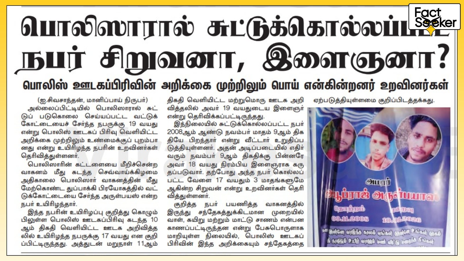 உயிரிழந்த அயூப்ராஜ் அருள் பயாஸின் வயது 17 : பொலிசாரின் அறிக்கையிலேயே தவறு ஏற்பட்டுள்ளது