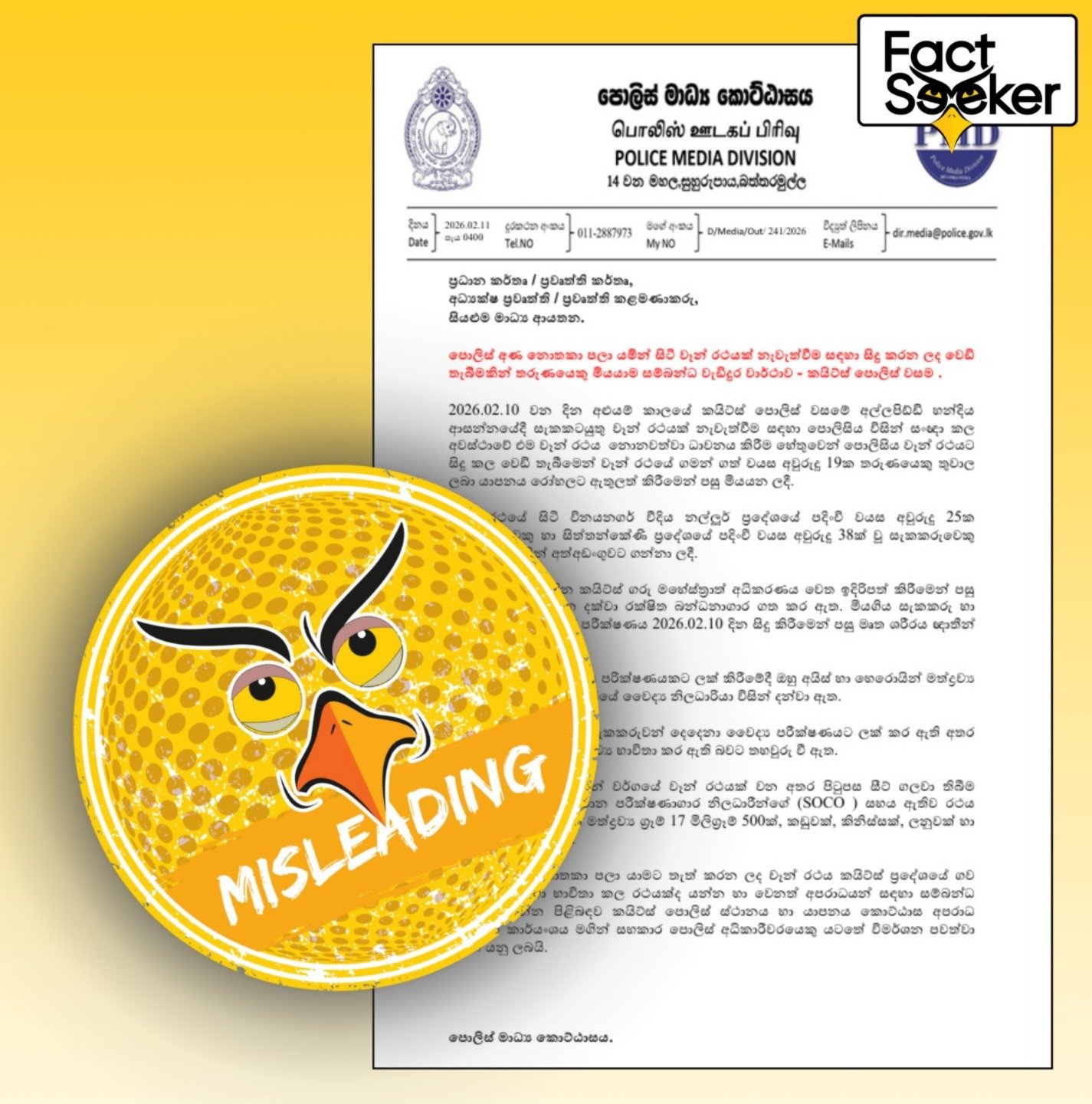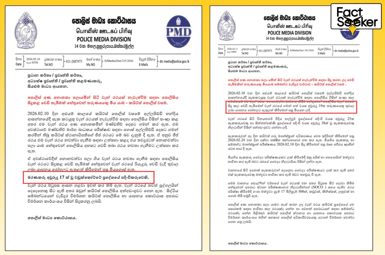 இந்த முரண்பாடு குறித்து FactSeeker ஆய்வு செய்தது. அதற்கமைய, குறித்த சம்பவம் தொடர்பில் கடந்த 10ஆம் திகதி பொலிஸார் வெளியிட்ட ஊடக அறிவிப்பிற்கும், மறுநாள் 11ஆம் திகதி அவர்கள் வெளியிட்ட அறிவிப்பிற்கும் இடையில் மரணித்தவரின் வயது குறித்து இருவேறு தகவல்கள் வழங்கப்பட்டிருப்பதை அவதானிக்க முடிந்தது.
