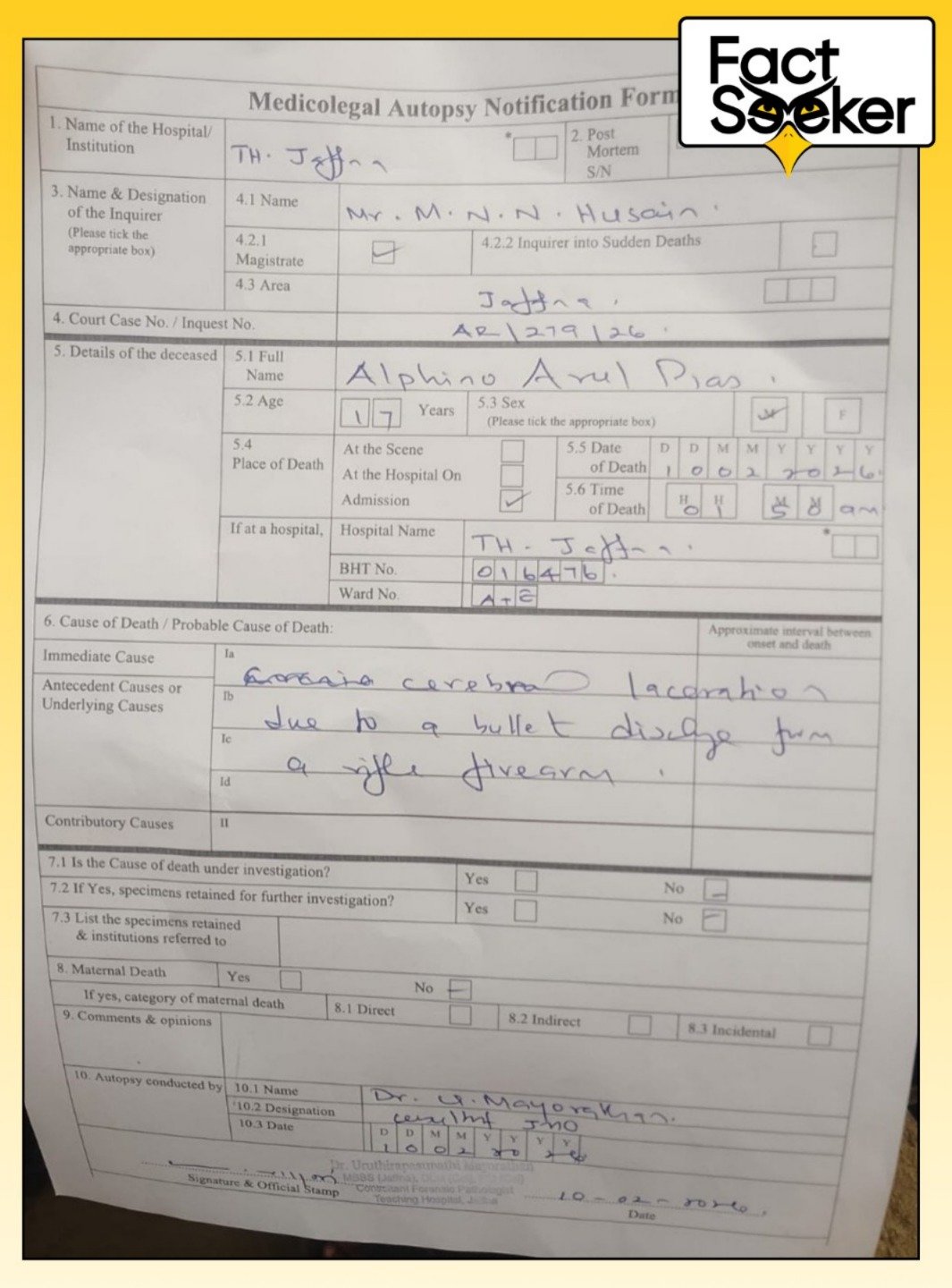 அதேபோல், உயிரிழந்தவரின் பிரேத பரிசோதனை அறிக்கையை ஆய்வு செய்தபோது, சட்ட வைத்திய அதிகாரி ருத்ரபசுபதி மயோதரன், நீதவான் எம்.என்.என். உசேனுக்கு அனுப்பிய அறிக்கையிலும் உயிரிழந்தவருக்கு 17 வயது என்றே குறிப்பிடப்பட்டுள்ளது.