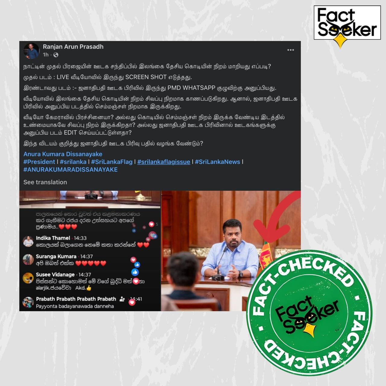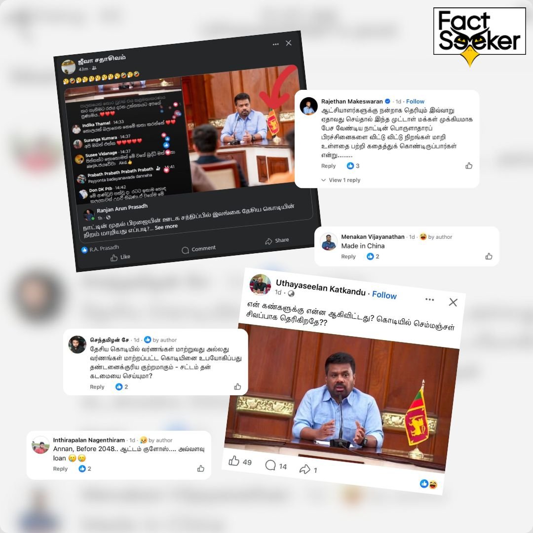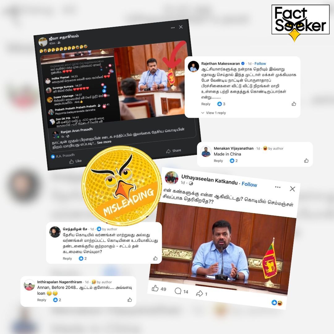 ஜனாதிபதி அநுர குமார திஸாநாயக்க கடந்த ( 17.03.2026 ) நடத்திய ஊடக சந்திப்பின் போது, மேசையில் வைக்கப்பட்டிருந்த இலங்கையின் தேசியக் கொடியின் நிறம் மாறியுள்ளதாக ஊடகவியலாளர் அருண் பிரசாத் தனது முகநூல் பக்கத்தில் பதிவிட்டிருந்தார். நேரலை வீடியோவில் கொடி சிவப்பாகத் தெரிவதாகவும், ஆனால் ஜனாதிபதி ஊடகப் பிரிவு (PMD) அனுப்பிய புகைப்படத்தில் சிவப்பு மற்றும் மஞ்சள் (குங்குமப்பூ நிறம்) நிறங்கள் இருப்பதாகவும் அவர் குறிப்பிட்டிருந்தார்.