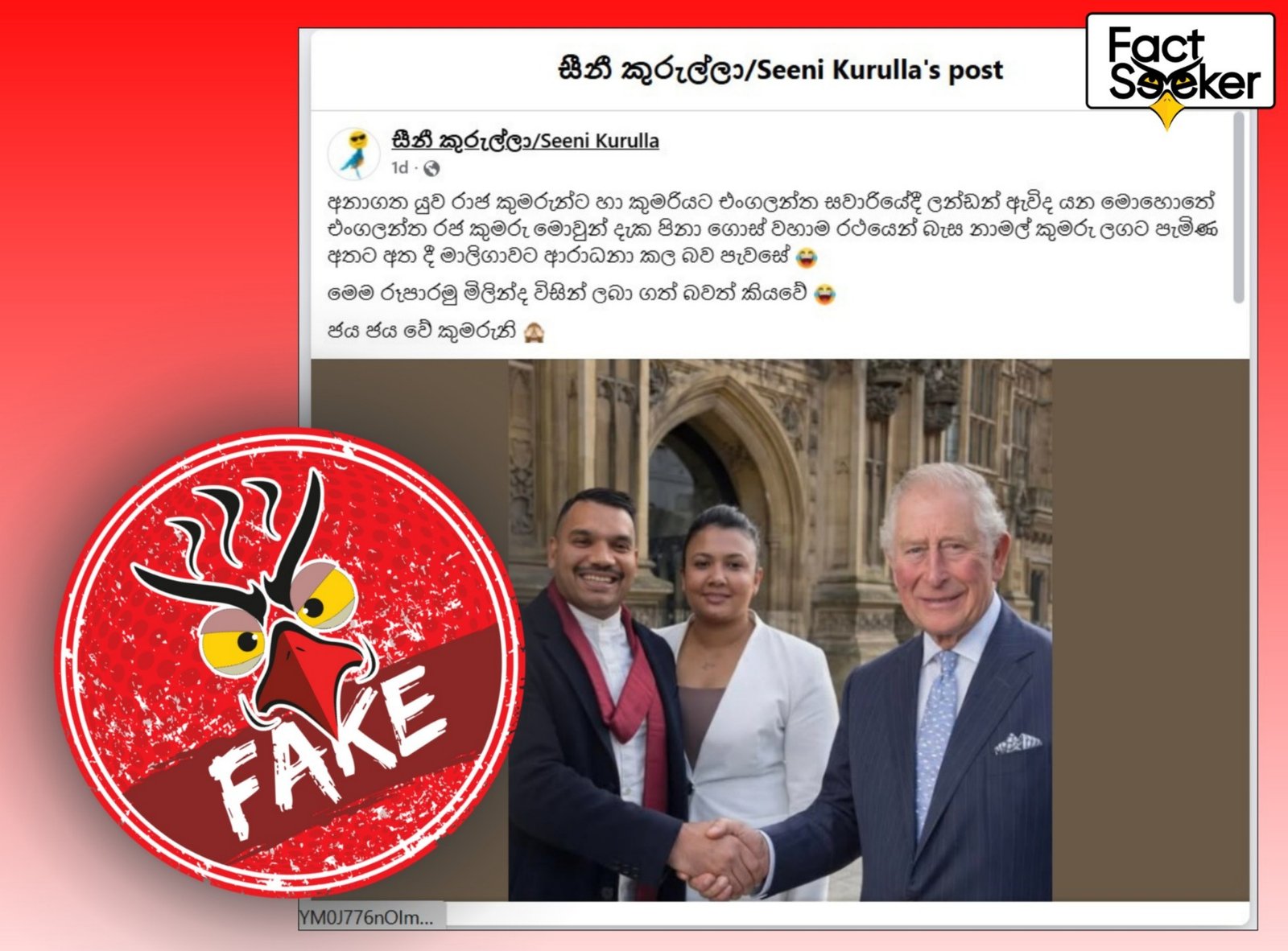 நாடாளுமன்ற உறுப்பினர் நாமல் ராஜபக்ஷ, மூன்றாம் சார்லஸ் மன்னரைச் சந்தித்ததாகப் பரவும் போலி புகைப்படம்